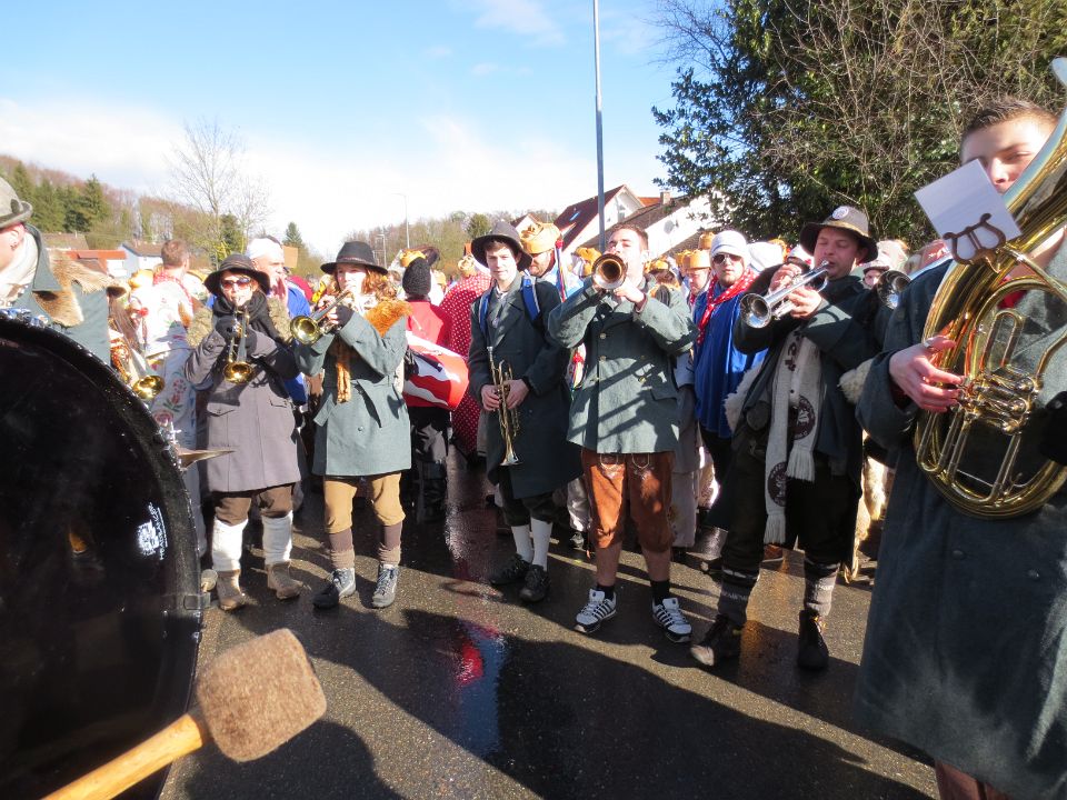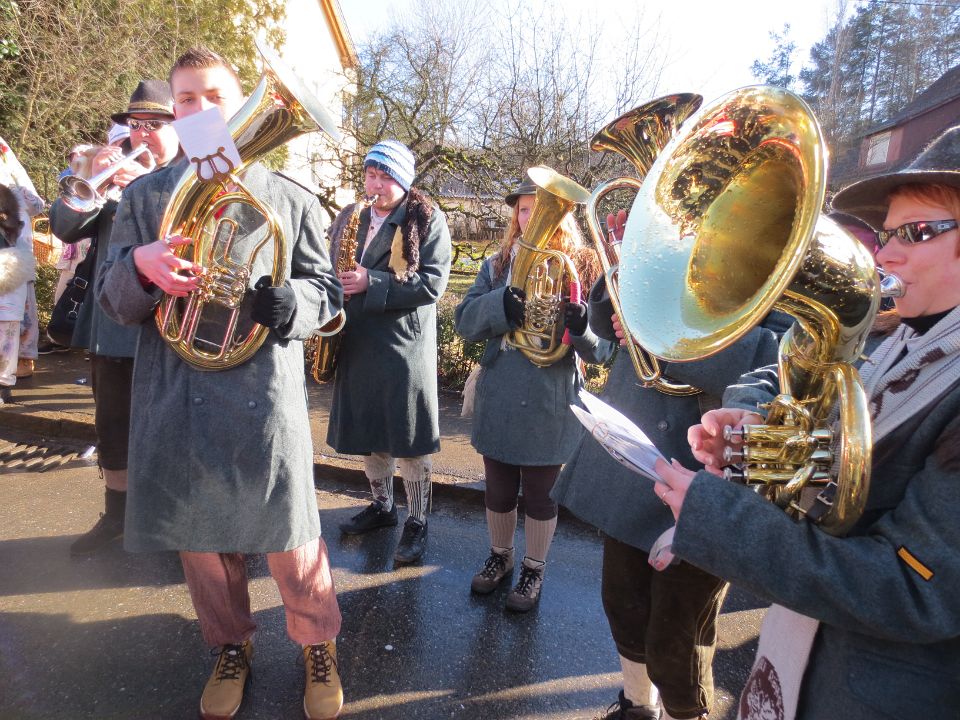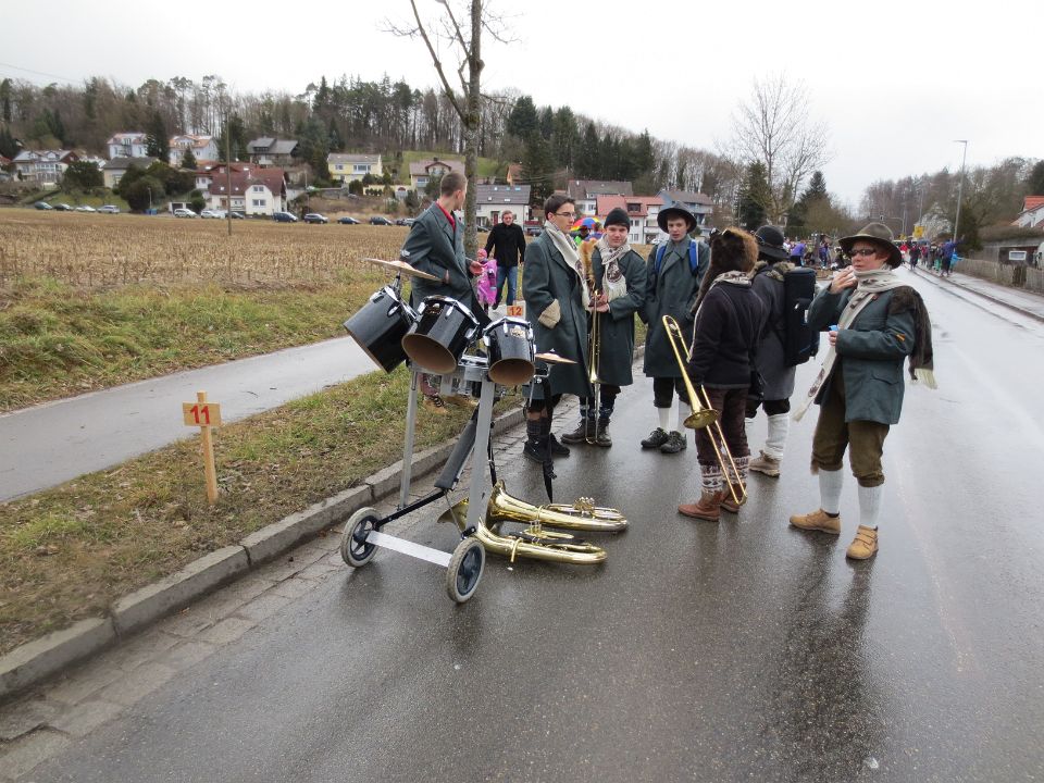 Ein Wetter wie im April erwartete uns beim VAN (Verband Alb-Bodensee-Oberschwäbischer Narrenvereine) Narrentreffen in Mühlhofen. Regen, Schnee, Sturm und Sonnenschein wechselten sich in munterer Reihenfolge ab. Unterstützt durch die Rielasinger Hansele und Fans aus unserer Narrenzunft hatten wir zum Schluss noch einen starken Auftritt in einem sehr kleinen Zelt, das wir bis zum letzten Platz füllten.